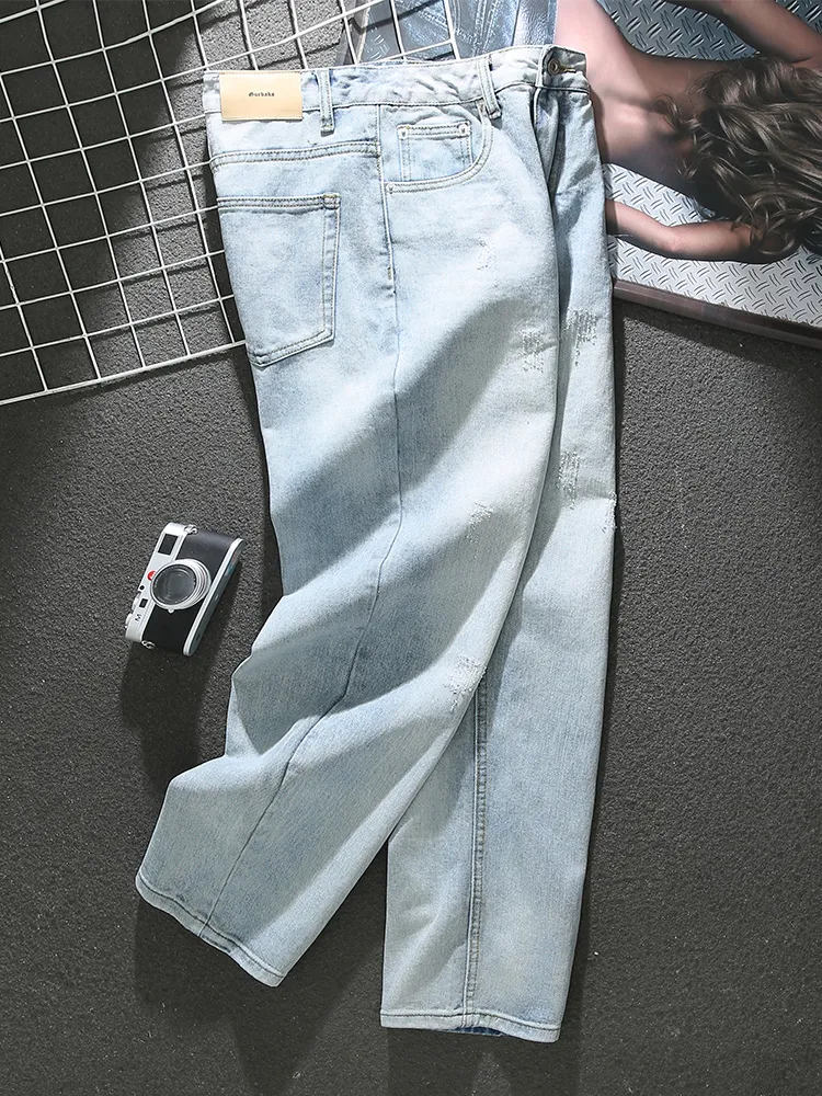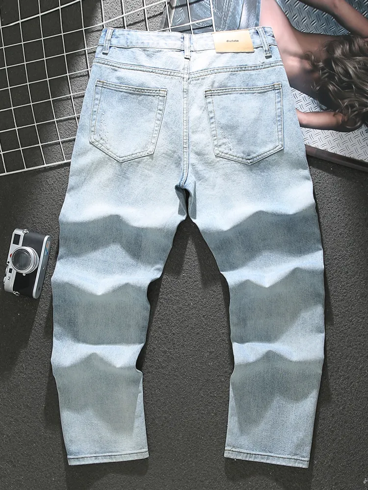 American washed distressed blue jeans for men 2023 new trendy cat scratched loose straight pants